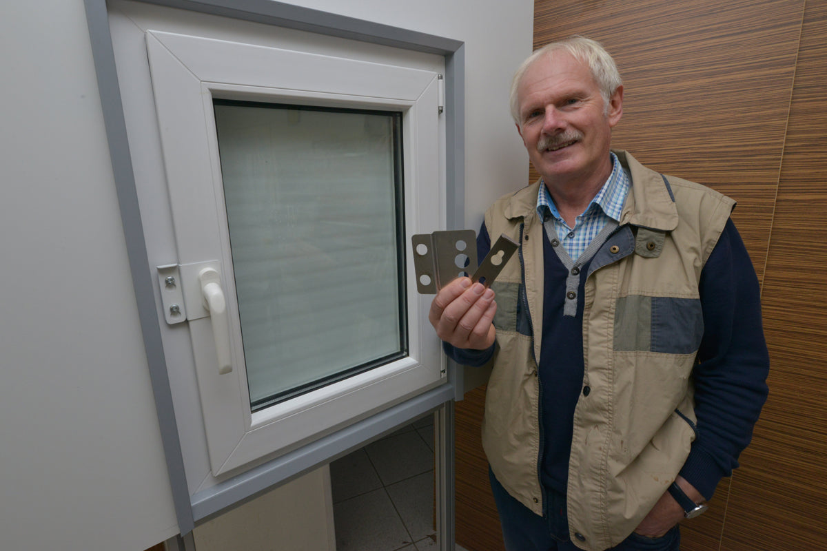 Alfons Zauner aus Pörndorf bei Passau hat eine Zusatzsicherung für Fenster und Türen gebaut, die für Einbrecher nur sehr schwer zu knacken sein soll. Der unauffällige Zusatzbeschlag aus Edelstahl erschwere Eindringlingen die Arbeit, sagt der Schreiner.